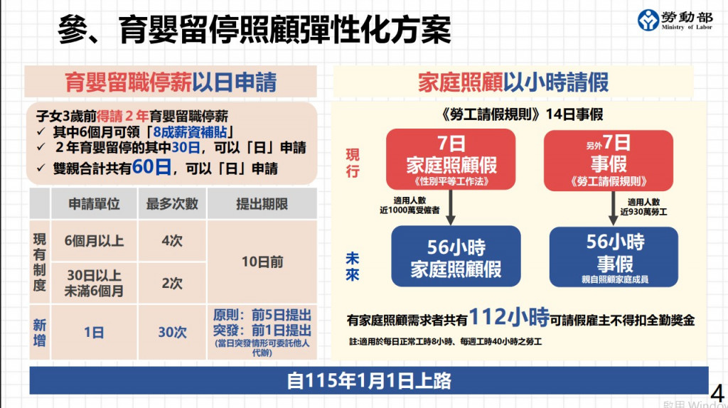 二、有關「育嬰留職停薪照顧彈性化」新制簡要說明如下: