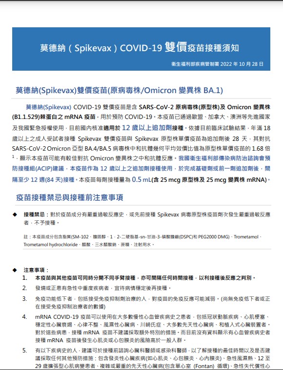 轉知 自111年11月1日起,Moderna (Spikevax) COVID-19雙價疫苗(原病毒株/Omicron變異株BA.1)實施對象擴及12歲至17歲青少年追加劑接種